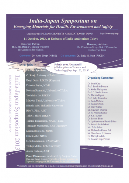 The Indian Scientists Association in Japan (ISAJ) organized 4th India-Japan Symposium on October 11, 2013, at the Indian Embassy Auditorium, Tokyo. The main theme of this year’s symposium was “Emerging Materials for Health, Environment and Safety.”